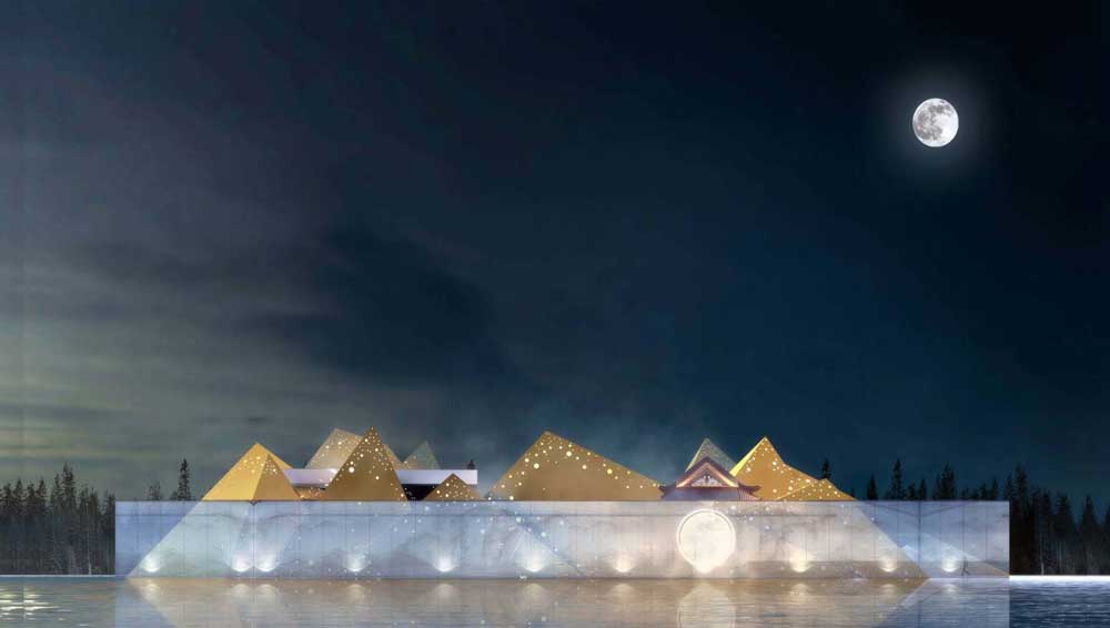 圖7為藝術展覽館。以月影為主題,形似金字塔,外墻采用古銅色鋁板密拼做法,四周外墻采用傳統(tǒng)的框架式玻璃幕墻。在月光下塔體倒映在玻璃外墻上形成像山脈一樣的山水畫,體現(xiàn)出了設計的藝術色彩。