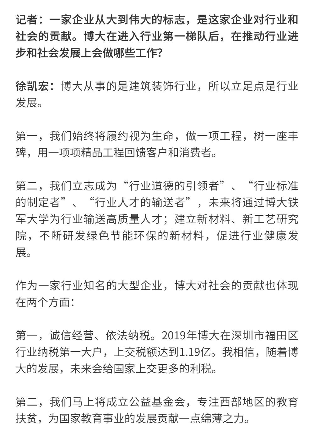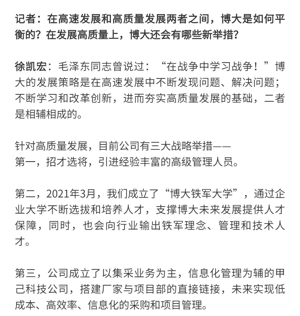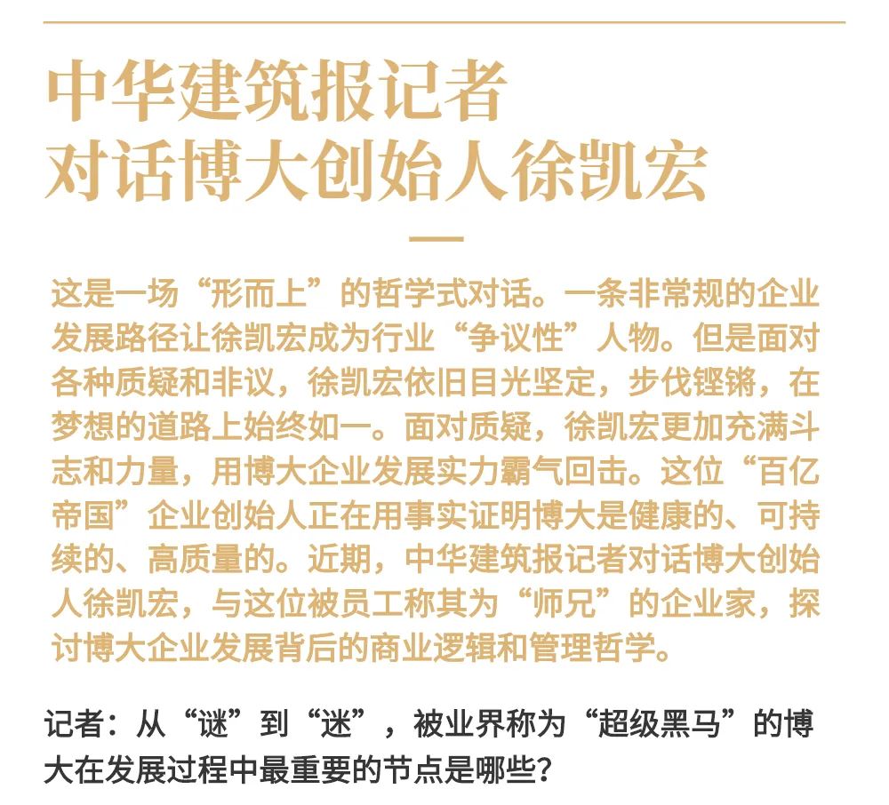 博大以雷霆之勢迅速崛起,吸引了行業(yè)的高度關注,行業(yè)權(quán)威媒體《中華建筑報》數(shù)次深入博大一線調(diào)研走訪,并對創(chuàng)始人徐凱宏先生進行了坦誠的訪談,以探討和總結(jié)博大發(fā)展的秘籍,并寫就了《進擊的博大:從高速到高質(zhì)量的創(chuàng)新逆襲》和《對話徐凱宏 | 博大正沿著高質(zhì)量發(fā)展道路堅定前行》兩篇文章。