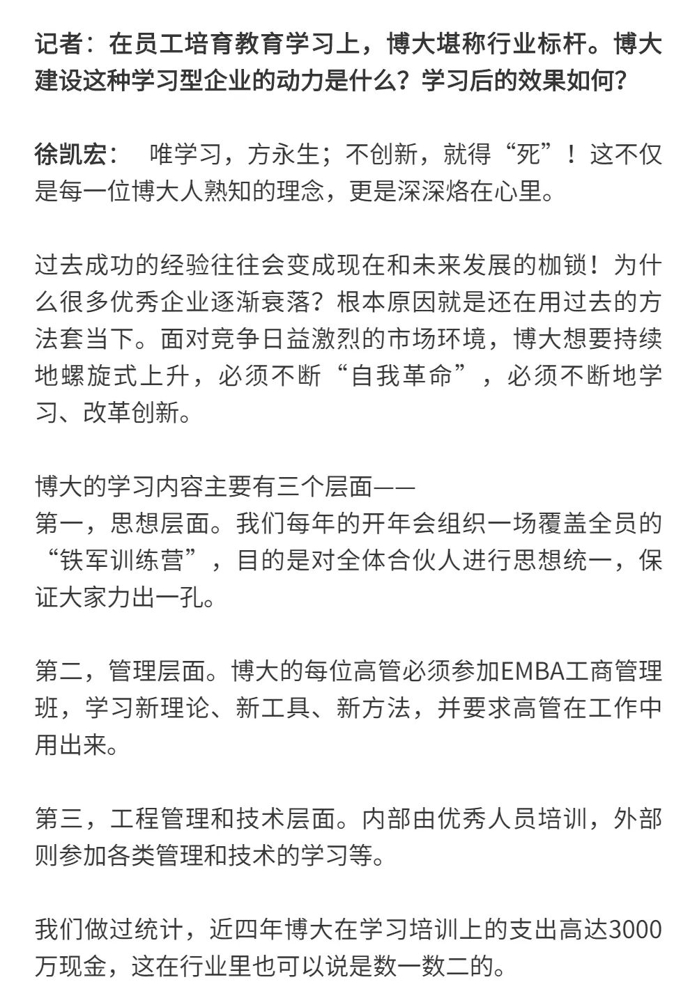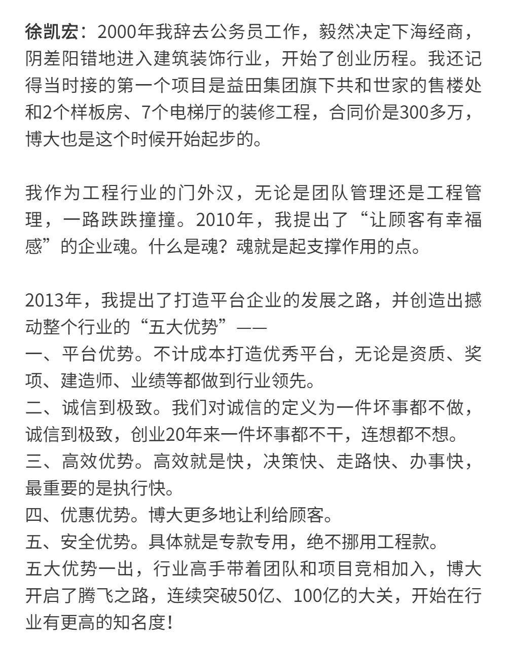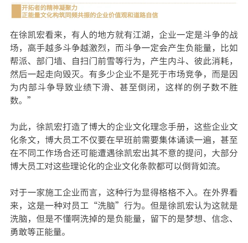 博大以雷霆之勢迅速崛起,吸引了行業(yè)的高度關注,行業(yè)權(quán)威媒體《中華建筑報》數(shù)次深入博大一線調(diào)研走訪,并對創(chuàng)始人徐凱宏先生進行了坦誠的訪談,以探討和總結(jié)博大發(fā)展的秘籍,并寫就了《進擊的博大:從高速到高質(zhì)量的創(chuàng)新逆襲》和《對話徐凱宏 | 博大正沿著高質(zhì)量發(fā)展道路堅定前行》兩篇文章。