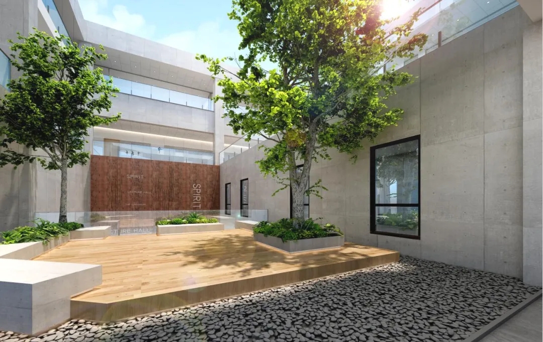 在滿是陽(yáng)光的露臺(tái)上,學(xué)員可以開展一些戶外的活動(dòng),所以在布局上需要一塊相對(duì)開場(chǎng)的區(qū)域,周邊利用花壇結(jié)合著座椅,做一些功能性的布置。