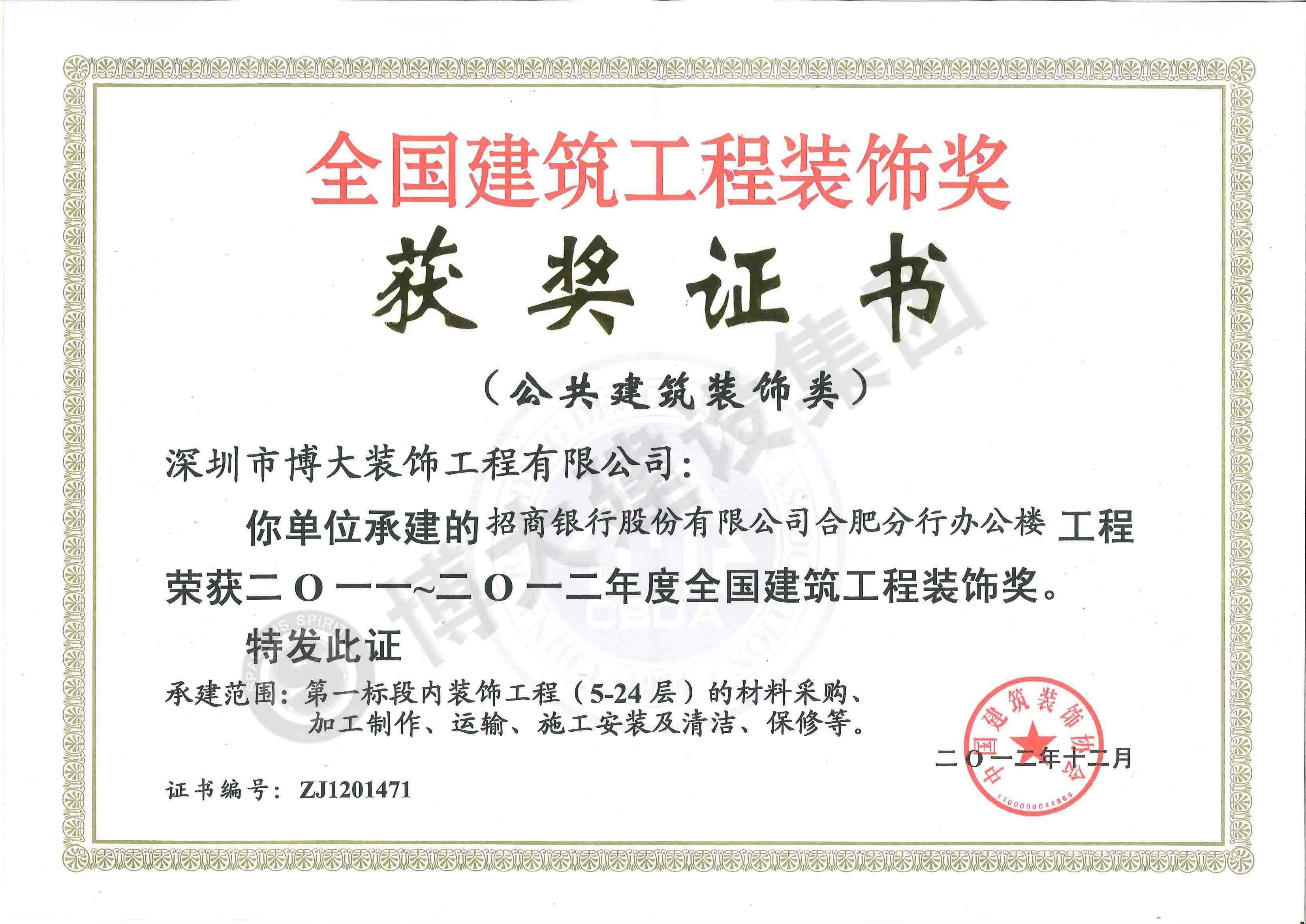 中國(guó)建筑工程裝飾獎(jiǎng)(招商銀行合肥分行-裝飾)