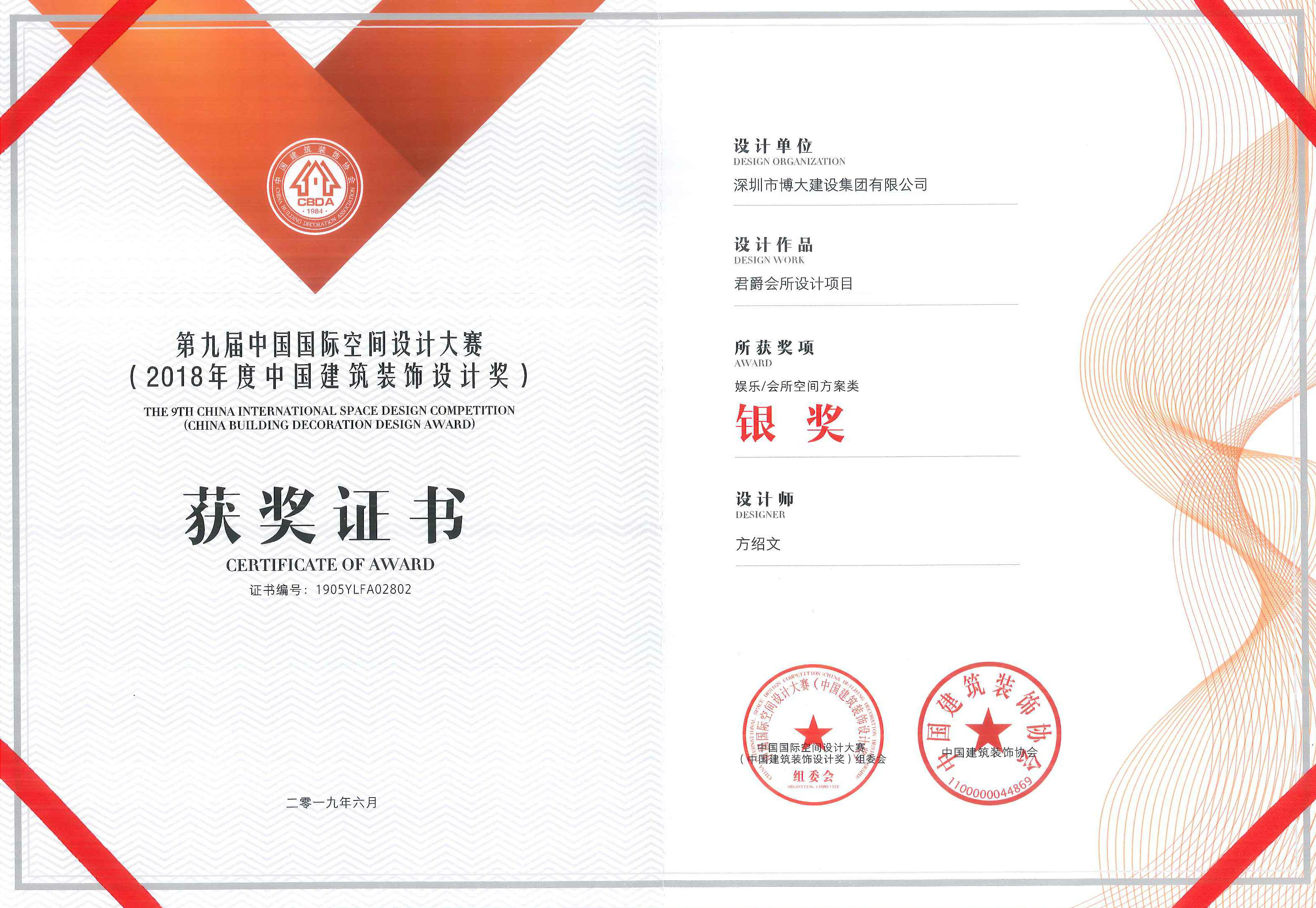 博大獲得2018年度中國(guó)建筑裝飾杰出幕墻設(shè)計(jì)機(jī)構(gòu),總裁李朕鴻榮獲商業(yè)方案類設(shè)計(jì)金獎(jiǎng),設(shè)計(jì)院院長(zhǎng)方邵文榮獲娛樂(lè)空間方案類設(shè)計(jì)銀獎(jiǎng)。