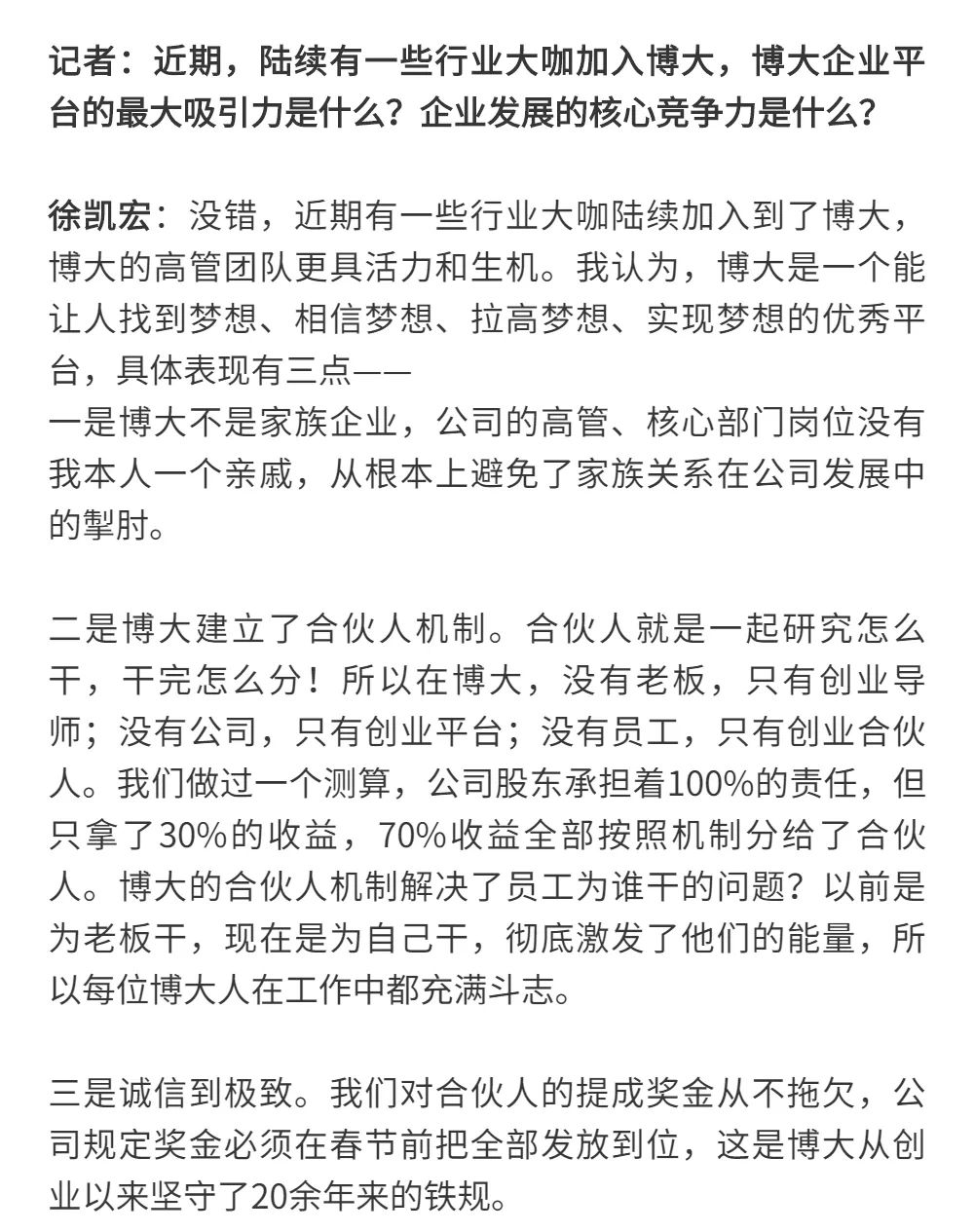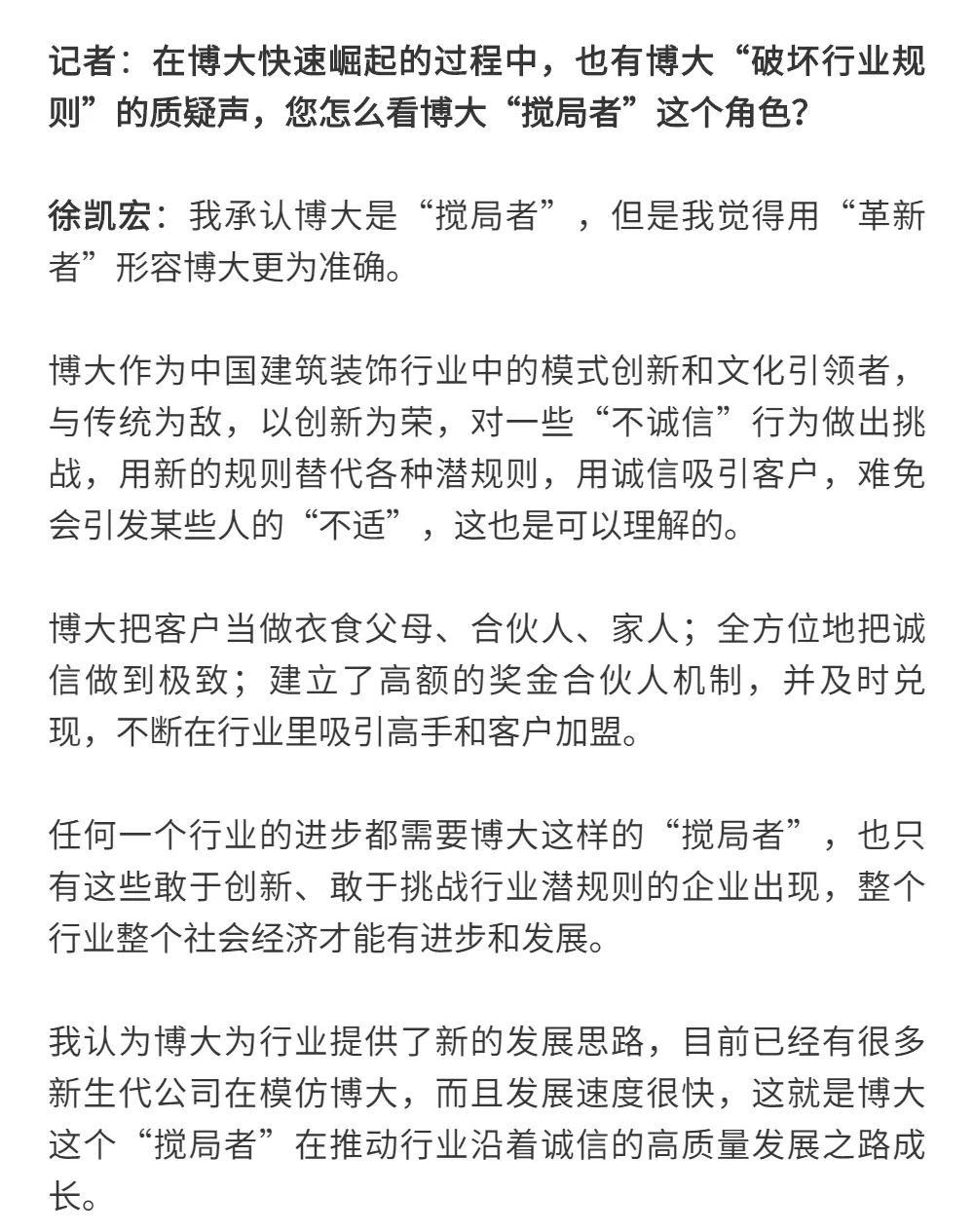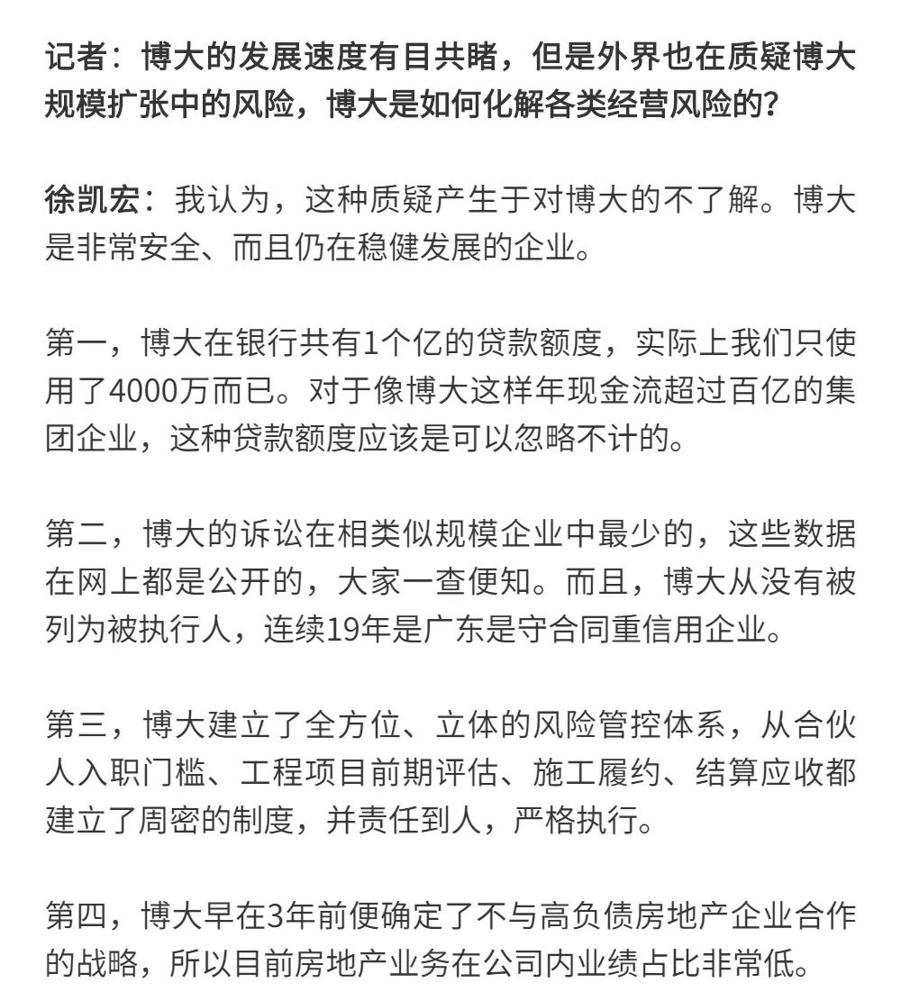 博大以雷霆之勢迅速崛起,吸引了行業(yè)的高度關注,行業(yè)權(quán)威媒體《中華建筑報》數(shù)次深入博大一線調(diào)研走訪,并對創(chuàng)始人徐凱宏先生進行了坦誠的訪談,以探討和總結(jié)博大發(fā)展的秘籍,并寫就了《進擊的博大:從高速到高質(zhì)量的創(chuàng)新逆襲》和《對話徐凱宏 | 博大正沿著高質(zhì)量發(fā)展道路堅定前行》兩篇文章。